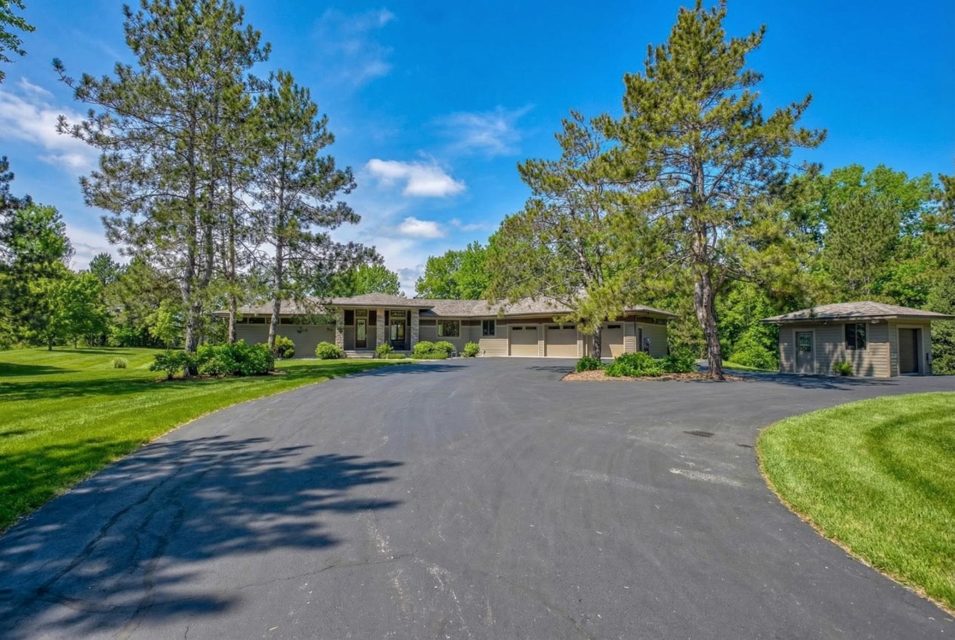 Tucked away on over 3 private, wooded acres with views of the 6th hole at St. Croix National Golf Club, this thoughtfully crafted 3 bed, 3 bath residence offers a refined take on craftsman design, where timeless detail meets a clean, high-quality finish. A long, private drive sets the tone, leading to a home that feels both distinctive and inviting, with a strong sense of intention throughout. Inside, the layout opens with soaring ceilings, rich wood floors, and a natural flow between the kitchen, dining, and living spaces. Expansive windows frame the surrounding landscape, while a striking fireplace with stone detail and wood accents anchors the living room. The chef's kitchen is both functional and beautifully appointed, featuring custom cabinetry, granite countertops, stainless steel appliances, an oversized center island, and a textured tile backsplash that adds depth and warmth, all seamlessly connected to the main living areas. Built-in speakers are integrated throughout the home, inside and out, elevating the atmosphere throughout the home, from quiet moments to lively gatherings. Designed for true main-level living, the owner's suite is filled with natural light and offers a spa-like bath with heated floors, double vanities, a walk-in shower, and a spacious walk-in closet with built-ins and in-closet laundry. A beautifully finished library with custom shelving provides a quiet retreat, while the four-season room with a wood-burning fireplace opens to a maintenance-free deck with a direct gas line for grilling. The walkout lower level is built for entertaining and flexibility, featuring heated floors, a double-sided fireplace, a full bar and kitchen ideal for guests or extended stays, and access to a custom-designed concrete patio. A spa-inspired bathroom with sauna, soaking tub, and custom lighting creates a true in-home retreat. Additional highlights include an oversized heated and insulated 3-car garage with a sink and floor drain, an expansive mudroom with cabinetry and countertops, extensive storage throughout, and a home security system.The outdoor setting offers a rare sense of space and privacy, with a sprawling yard framed by mature trees, ideal for gathering, recreation, or simply enjoying the surroundings. An irrigation system with app control helps keep the landscape looking its best, while a fenced dog run and utility shed add everyday functionality. Take in peaceful golf course views, host on the deck or patio, and enjoy the quiet of a tucked-away setting with convenient access to Highway 35 for an easy commute . From the serene setting to the intentional craftsmanship, every detail comes together to create something truly special. Schedule your private showing and experience it in person.